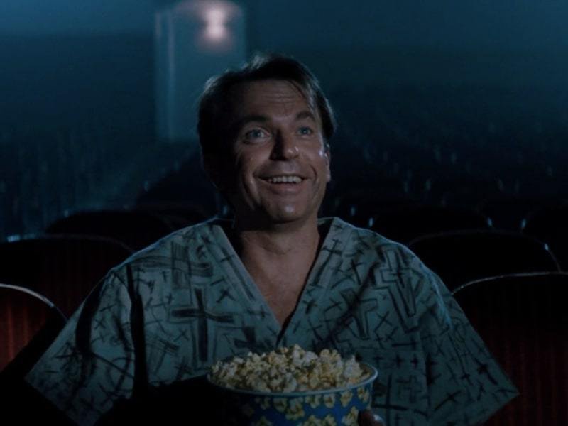 The framing device of the movie, Trent in a padded cell explaining his story to Dr. Wrenn and finally walking the deserted streets, is where Neill gives what might be the single most quietly devastating moment in the trilogy. The laughing in the cinema. It starts as a regular movie-crazy laugh but keeps going, changing character and becoming more genuine and more terrible. It’s the laugh of a man who has finally understood the cosmic joke and found it honestly hilarious. The laugh of someone for whom sanity is no longer an option. Neill holds it for a little longer than is comfortable and in doing that, changes what could have been a cliché into something which feels like a real emotional truth. It looks like when someone totally comprehends their own irrelevance in the face of cosmic indifference. It looks like that laugh.